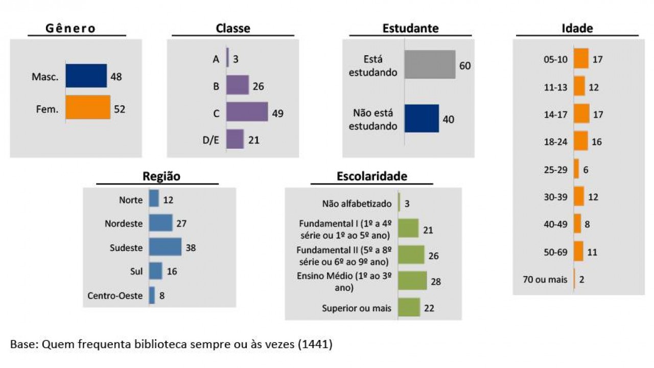 Segundo a pesquisa, cerca de 34 milhões de pessoas frequentam bibliotecas no País, sendo a maioria pertencente à classe C (49%), seguida da B, com 26% e D/E, com 21%. Os estudantes são 60% dos frequentadores. A principal motivação para ir à biblioteca é ler livros para pesquisar ou estudar (51%) e, em seguida, ler por prazer (33%).